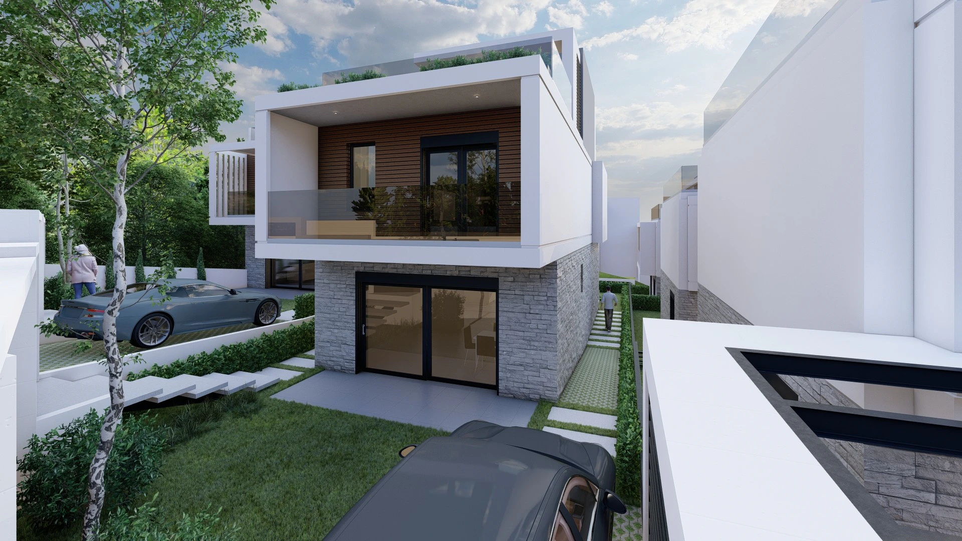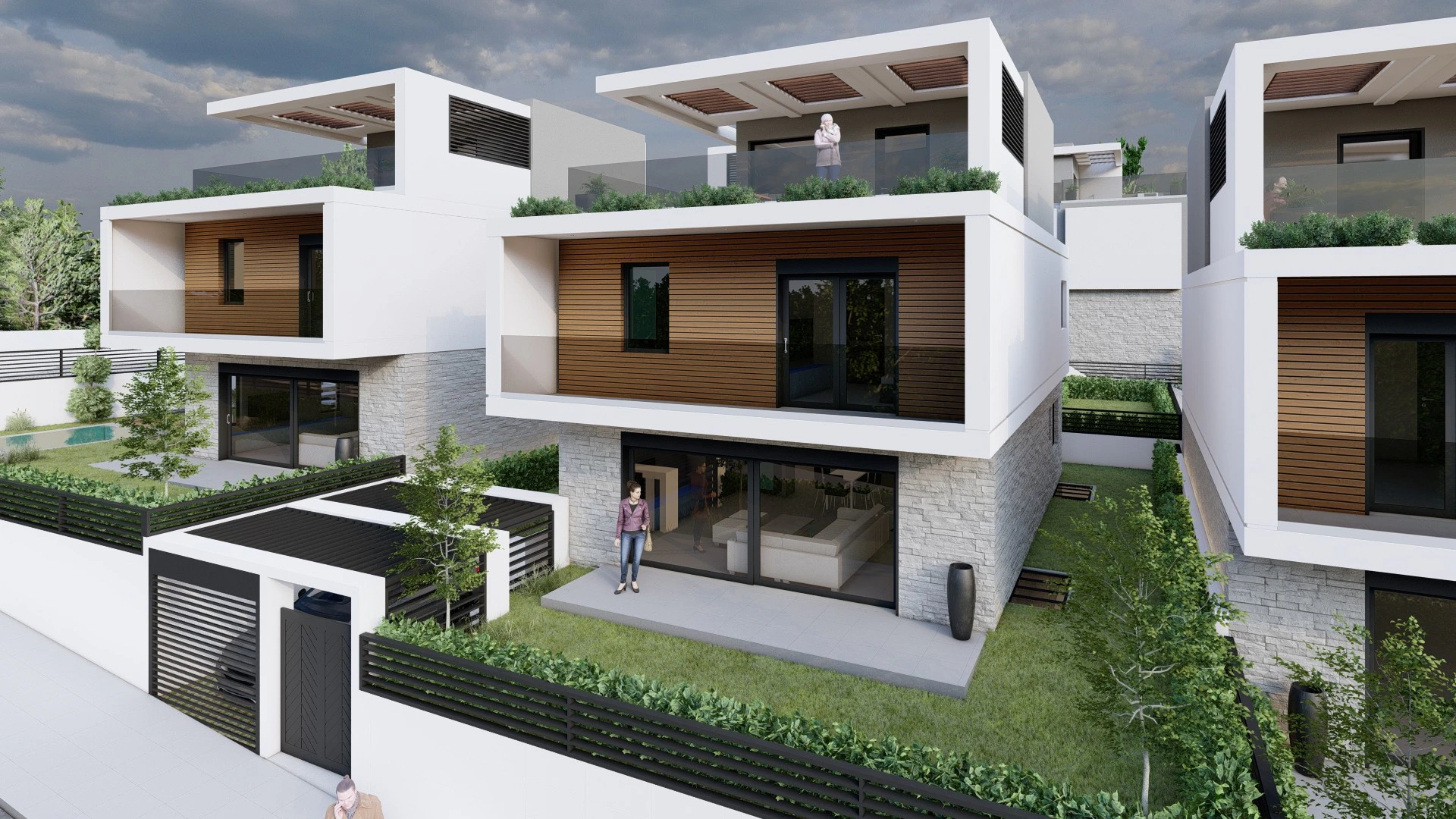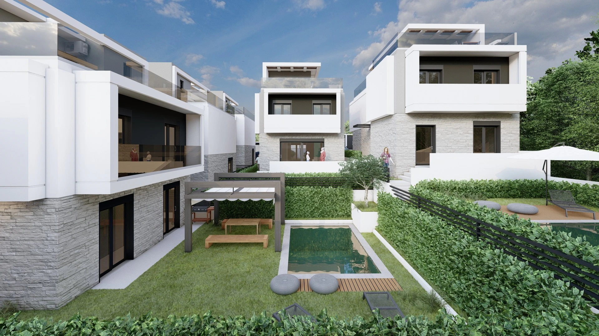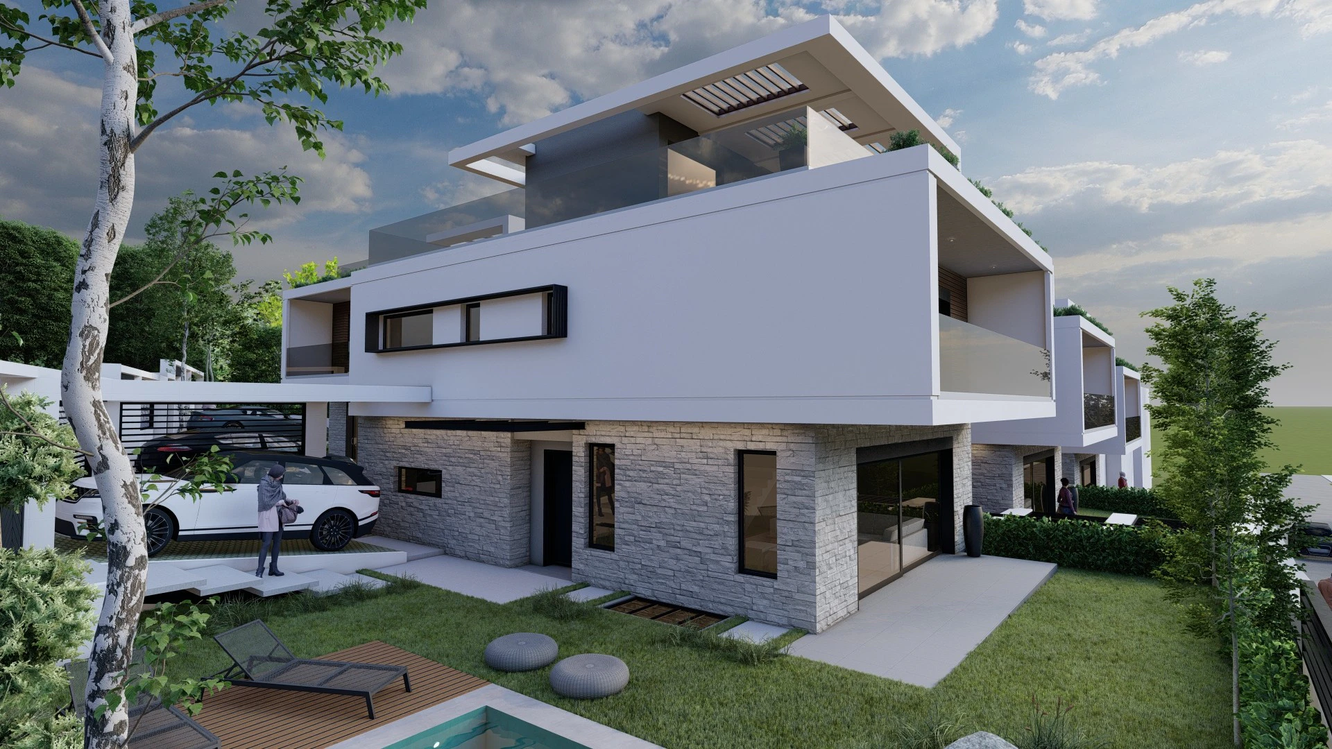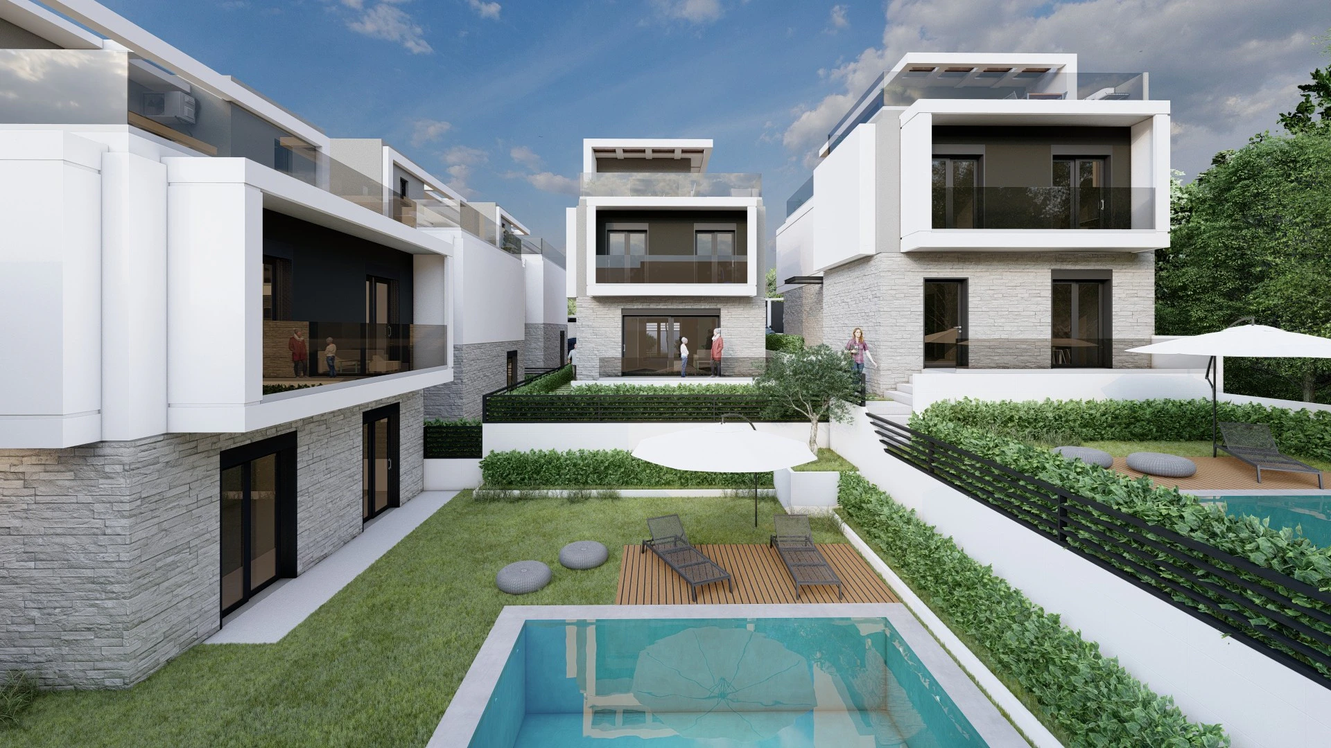 Construction of five luxurious single-family homes with sea view, private parking, roof garden and pools. Located in the Liogermа Thermi area.