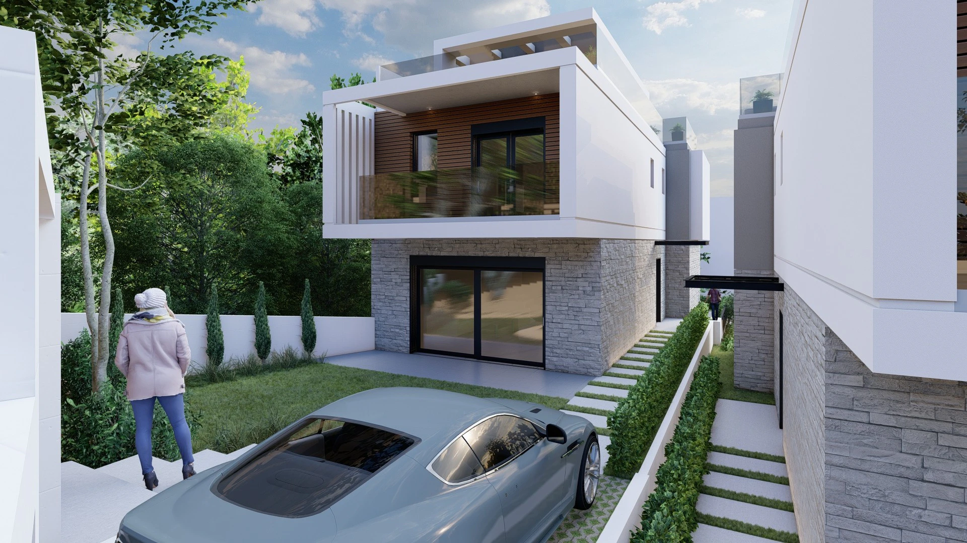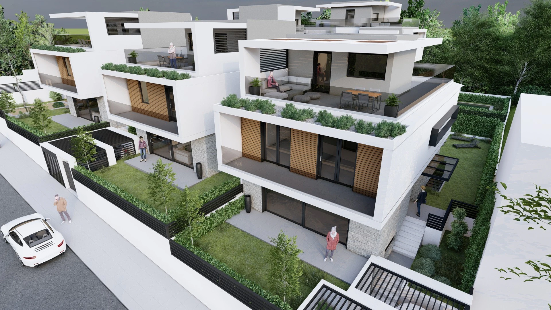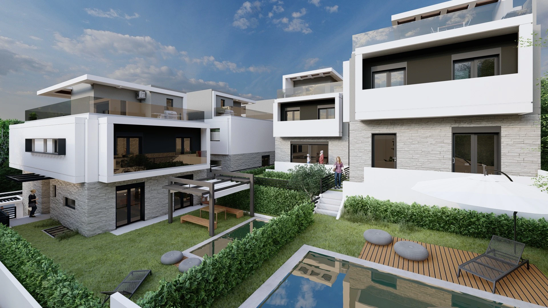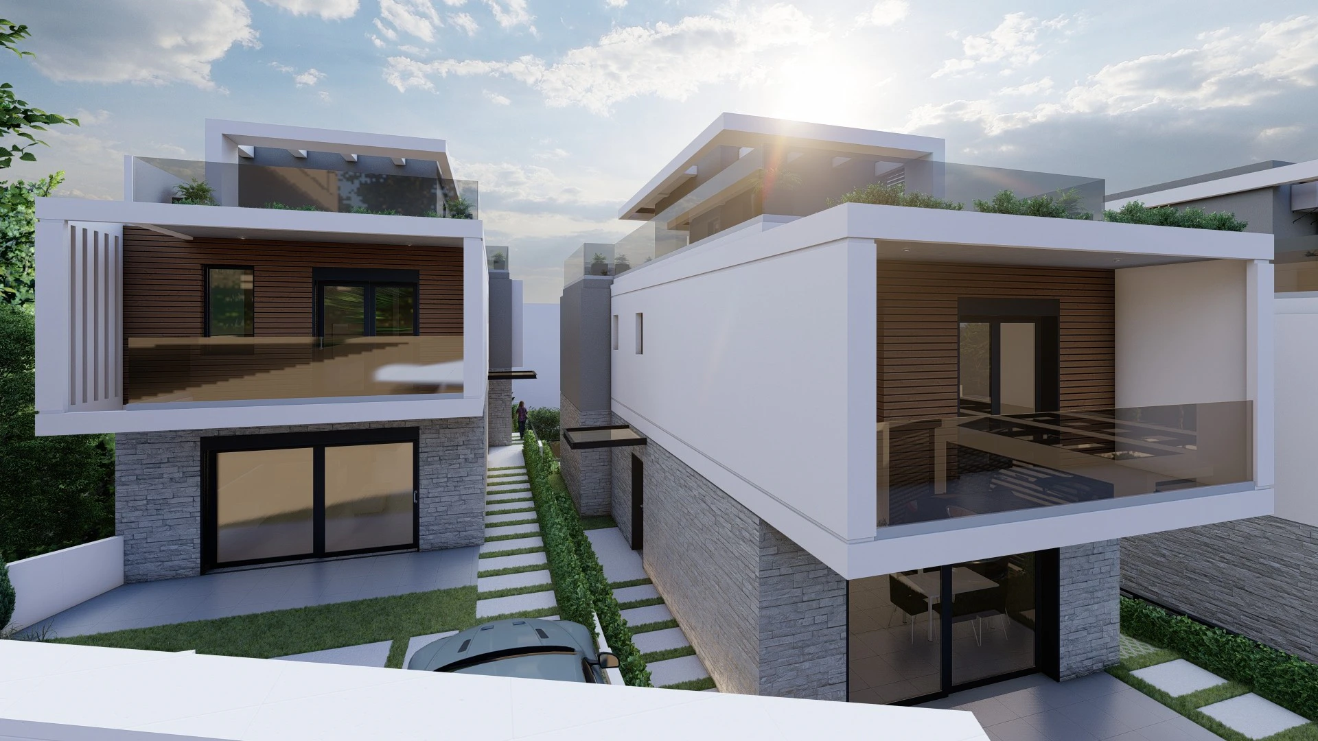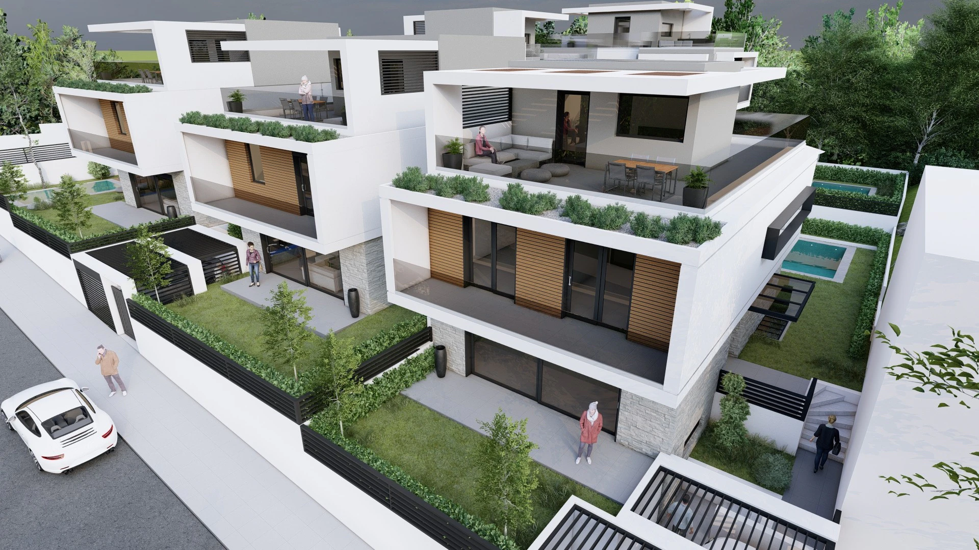 Construction of five luxurious single-family homes with sea view, private parking, roof garden and pools. Located in the Liogermа Thermi area.