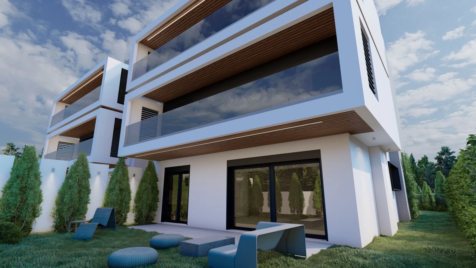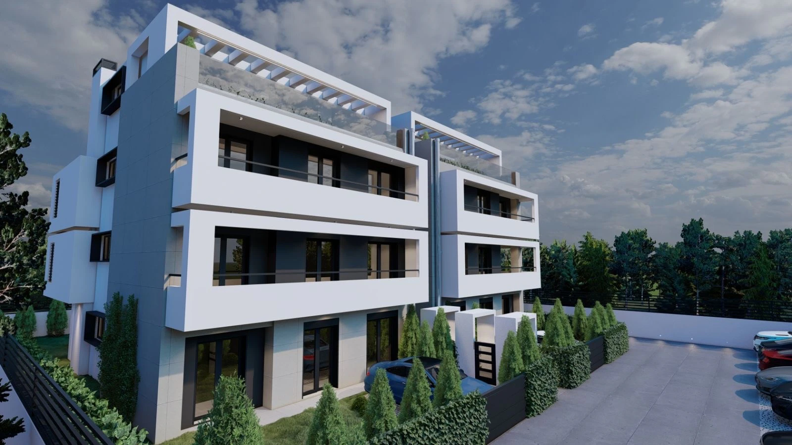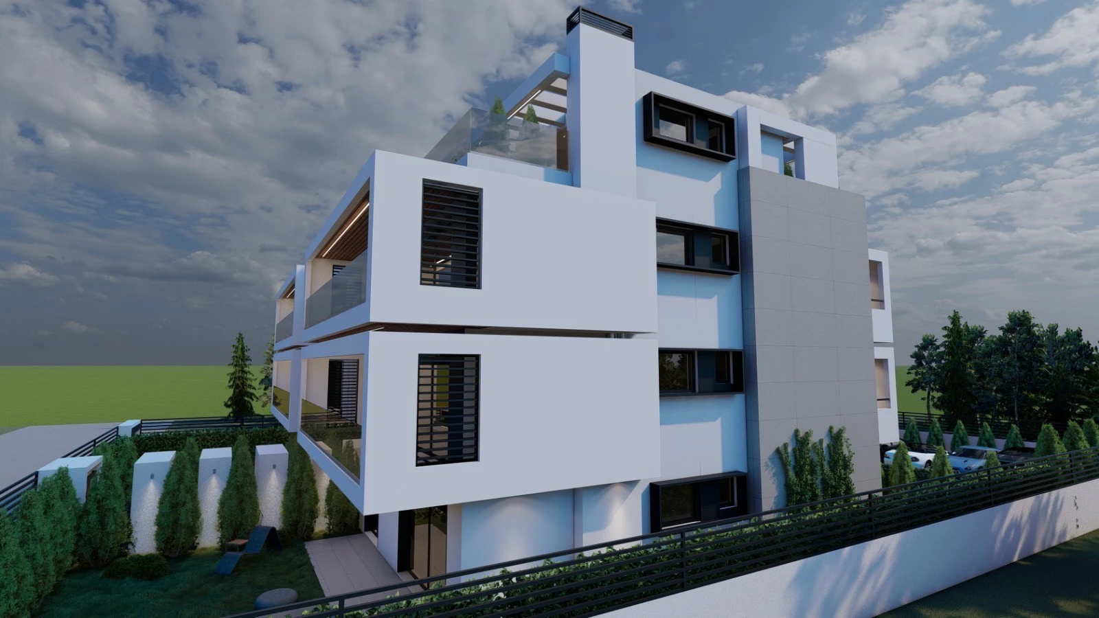 Construction of a modern building with seven apartments of high specifications with parking and pools on the ground floor and roof garden.