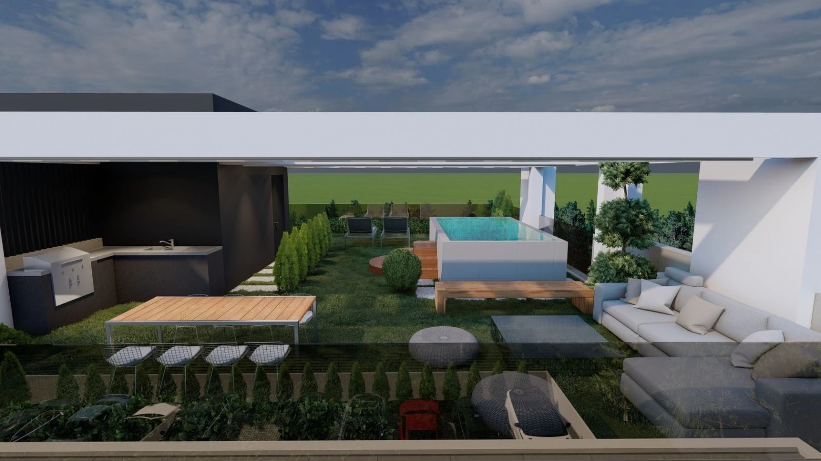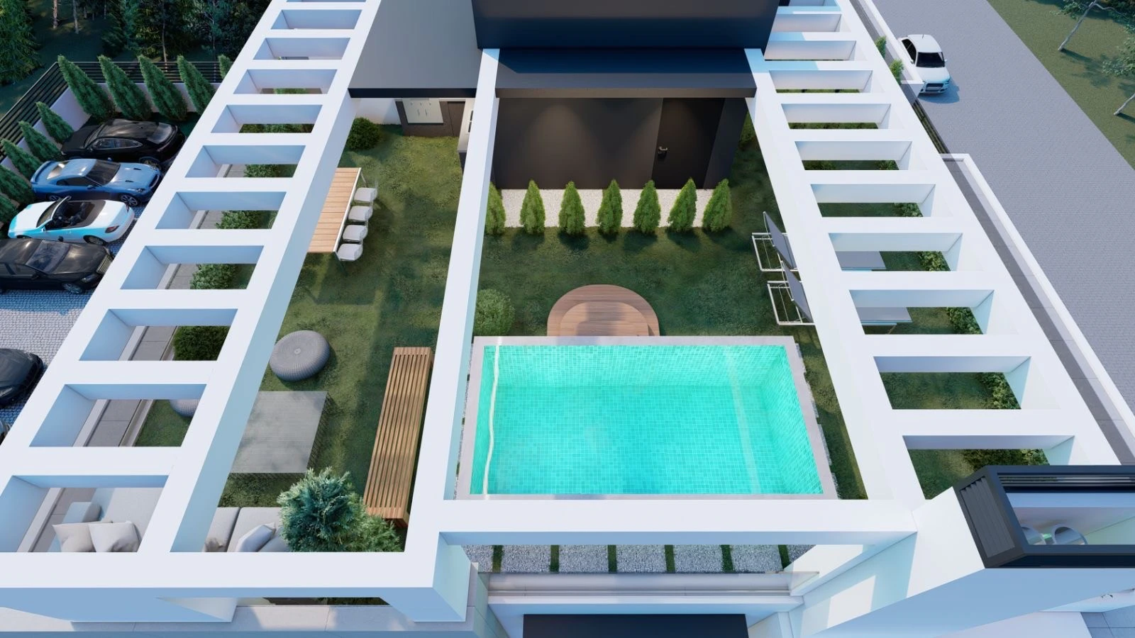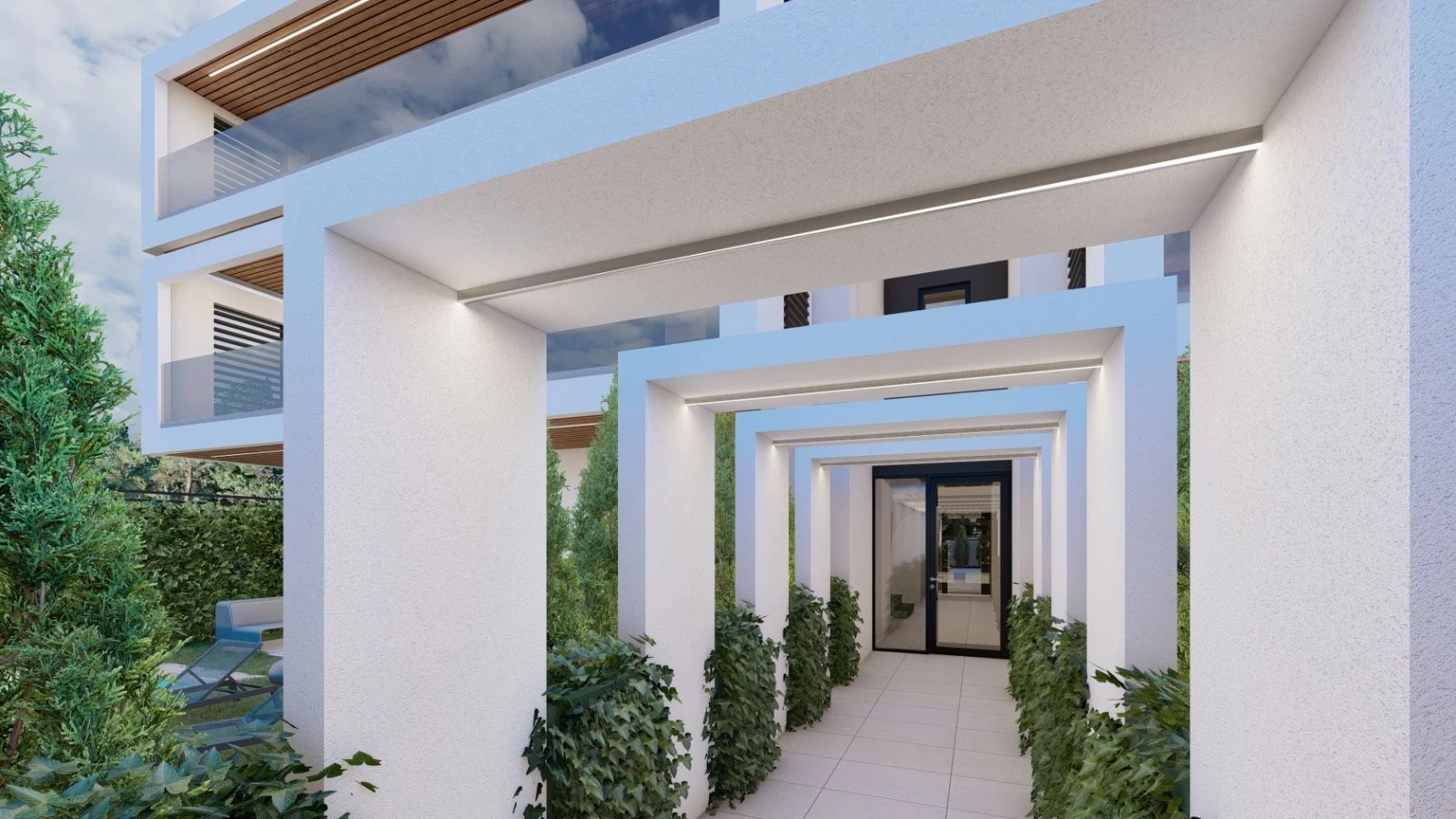 Construction of a modern building with seven apartments of high specifications with parking and pools on the ground floor and roof garden.